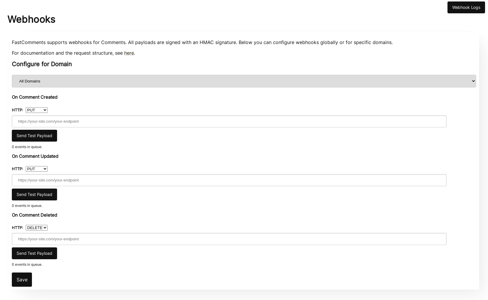 На овој страници можете да наведете endpoints за сваки тип догађаја везаног за коментаре.